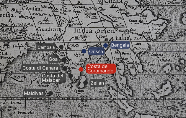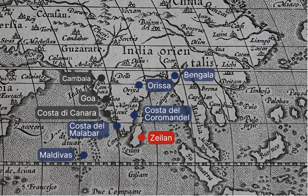 “Vicino a Coromandel, detto Messoli anticamente, è un'altra terra chiamata Paliacatte, e anticamente Salaceni. In questa terra si trova grandissima quantità di gioie d'ogni sorte, che vengono parte di Pegu, dove nascono rubini, parte da un'isola che giace a riscontro del capo di Commari, che si chiama Zeilan […]. Qui nascono la maggior quantità e di piú spezie di gioie che nel resto di tutta l'India, cioè zaffiri perfetti, rubini, spinette, balasci, topazii, giacinti, grisoliti, occhi di gatta (che da' Mori sono avute in grand'estimazione) e granate. […]. Cogliesi anche in questo luogo la cannella, che per tutto si naviga. Tiene il paese gran copia di elefanti, ch'essi vendono a diversi mercanti dell'India mentre che sono piccoli, per potergli domesticar: e costumasi a vendergli tanto il palmo, crescendo sempre di prezzo con detto palmo, secondo la grandezza dell'elefante.”
