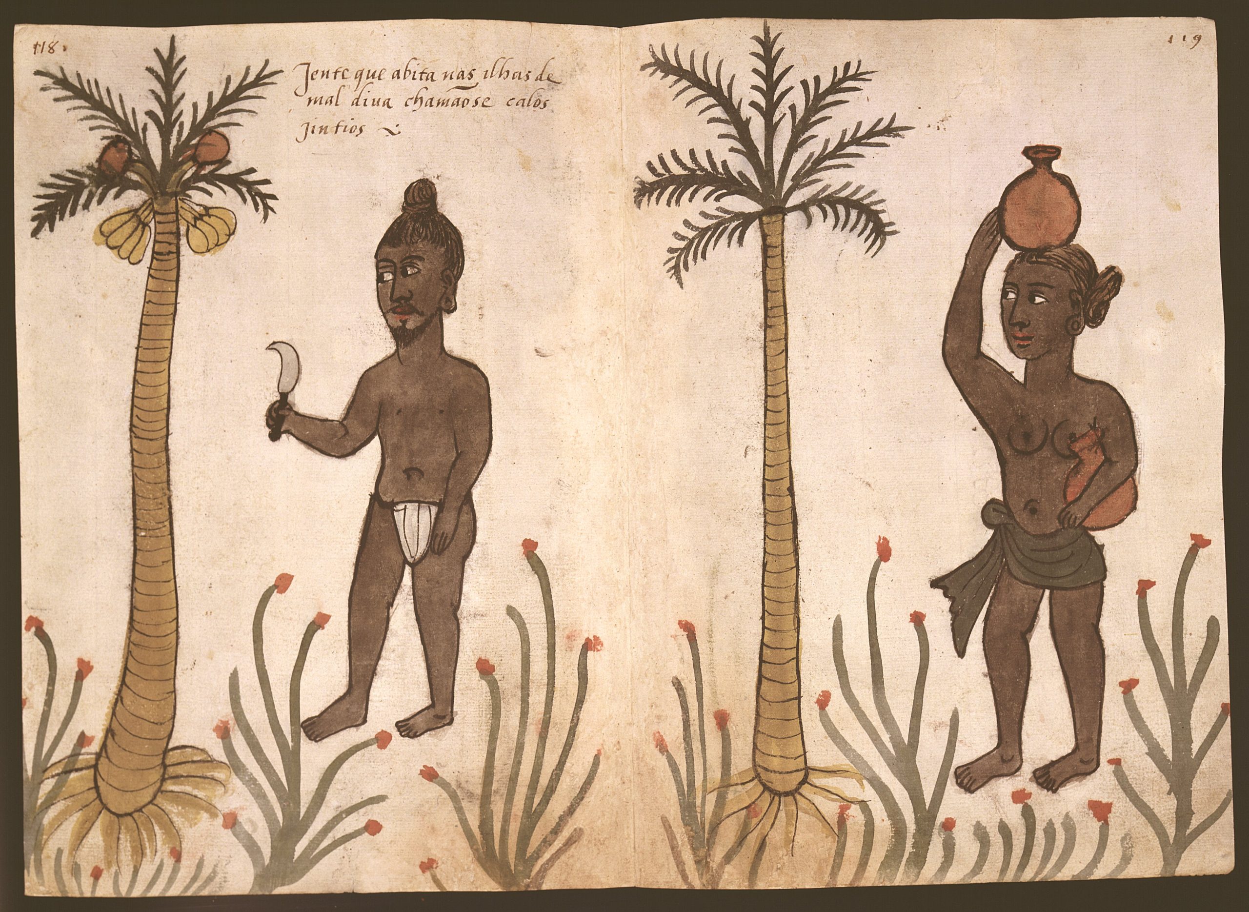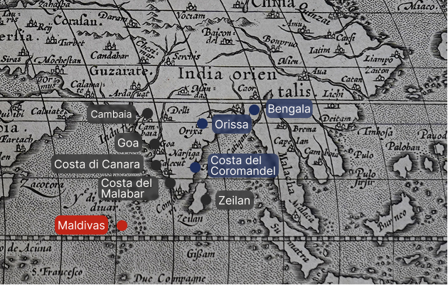 “Al traverso di questo paese di Malabar, da centoventi miglia in mare vi è un arcipelago d'isole, che gl'Indiani dicono essere da dicessettemila: e cominciano dal monte Dely, distendonsi verso il mezzodí. Le prime sono quattro isole piccole e piane, che si chiamano di Maldivar: sono abitate da Mori malabari, e dicono che sono del re Cananor. Non vi nasce in quelle altra cosa se non palmiere, dalli frutti delle quali, e del riso che conducono di Malabar, vivono gli abitanti in dette isole, e lavorano molte sartie del cairo, che è la coperta di cochi di dette palmiere.”