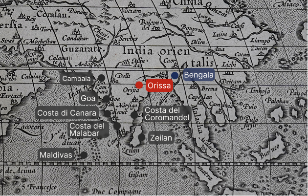 “Passato il regno di Narsinga, avanti per la costa comincia il regno di Orixa, che è di Gentili, che sono uomini valenti e molto esercitati nell'armi, perché quasi di continuo questo re tien guerra con quello di Narsinga, ed è molto potente di genti a piedi. La maggior parte del suo paese è lontana dal mare, sopra il qual vi son pochi porti e anco di poco traffico; questo paese si prolonga dietro la costa del mare sin al fiume Gange, che nella loro lingua chiamano Guengua, e dall'altra parte del detto fiume comincia il regno di Bengala, col quale alcune volte questo re ha guerra. A questo fiume Gange vanno tutti gl'Indiani in peregrinaggio con gran divozione a lavarsi, perché hanno firmissima fede che, dapoi lavati, siano netti di tutti li lor peccati e per questo salvi, conciosiacosaché il detto fiume vien da un fonte il qual ha il suo principio nel paradiso terrestre.”