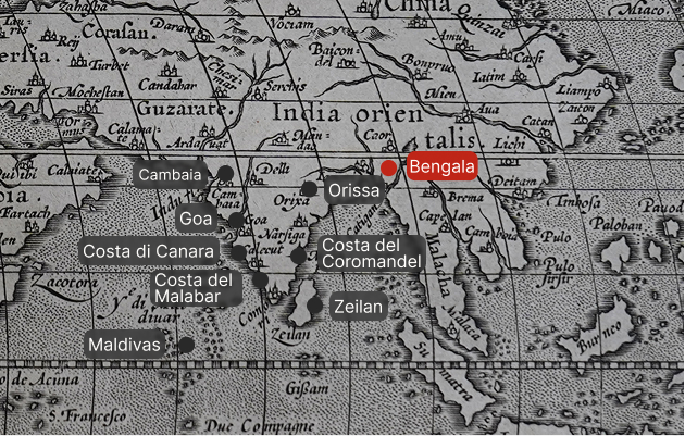 “Passato il Gange, per la costa avanti verso levante sta il regno di Bengala, nel quale vi sono molti luoghi e città, cosí fra terra come dietro la costa del mare. Quelli fra terra son abitati da Gentili, che stanno sotto l'obbedienza del re di Bengala, il quale è moro; e li porti da mare sono pieni di Mori e Gentili, fra li quali vi sono gran traffichi di mercanzie e navigazioni per molte parti, perché questo mare è a modo d'un golfo che entra verso tramontana, in capo del quale è posta una gran città abitata da Mori, che si chiama Bengala, con un buon porto. Li abitatori di quella sono uomini bianchi, ben disposti, e vivono in detta città infiniti forestieri di molte parti, cosí di Arabia come di Persia e abissini. E per essere il paese molto grande e di aere temperato, vi concorrono infinite persone, e tutti gran mercatanti, e hanno delle navi grandi fatte al modo di quelle della Meca, e altre al modo di quelle della China, che chiamano giunchi, che sono molto grandi e portano gran carico: e con queste navigano verso Coromandel, Malabar, Cambaia, Tarnasseri, Sumatra, Zeilam e Malaca, e trafficano ogni sorte di mercanzie da una parte all'altra. Vi nasce di molto bambagio, e di quello che è fino, e molte canne di zucchero e gengievo buono e molto pepe lungo. Si lavorano quivi molti panni di bambagio eccellentemente dipinti per il lor vestire, e alcuni altri bianchi che sono per mercanzia per diverse parti, e li chiamano saranetis, che sono vergati come fazzuoli da donne, delli quali quivi se ne fa grandissima stima […] e sono molto stimati per far camicie, perché durano longamente […] In detta città si fa zucchero bianco e buono […] e ne caricano molte navi per diverse parti. […].”