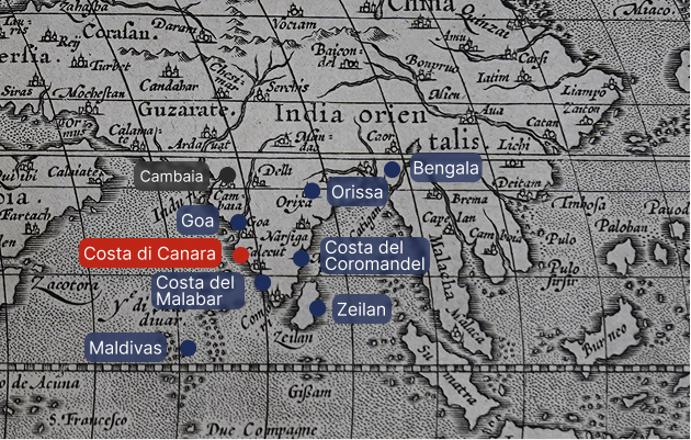“La terza divisione che divide la provincia Canarà del Decan finisce nel capo Comorii, principiando dal fiume Aliga, dove vi saran cento leghe, per questa maniera: da Aliga fin ad un altro fiume nominato Cangerecora, che è cinque leghe alla tramontana del monte Delii, capo notabile in questa costa, vi saran quarantasei, nella qual costa vi sono queste abitazioni: Ancola, Egorapam, Mergeu, la città di Onor, capo del regno, Baticala, Bendor, Bracelor, Bacanor, Carcara, Carnate, Mangalor, Mangeiron, Cumbata e Cangerecora, per la qual corre un fiume di questo nome, che è la estrema divisione, come si vederà a basso. Le quali abitazioni tutte sono della provincia Canarà, suddite al re di Bisnagar, qual è tanto potente di paese che participa di duoi mari, cioè di questo ponente, e dell'altro di levante che giace del capo Comorii per dentro, entra solamente qui con questa picciol parte maritima.”