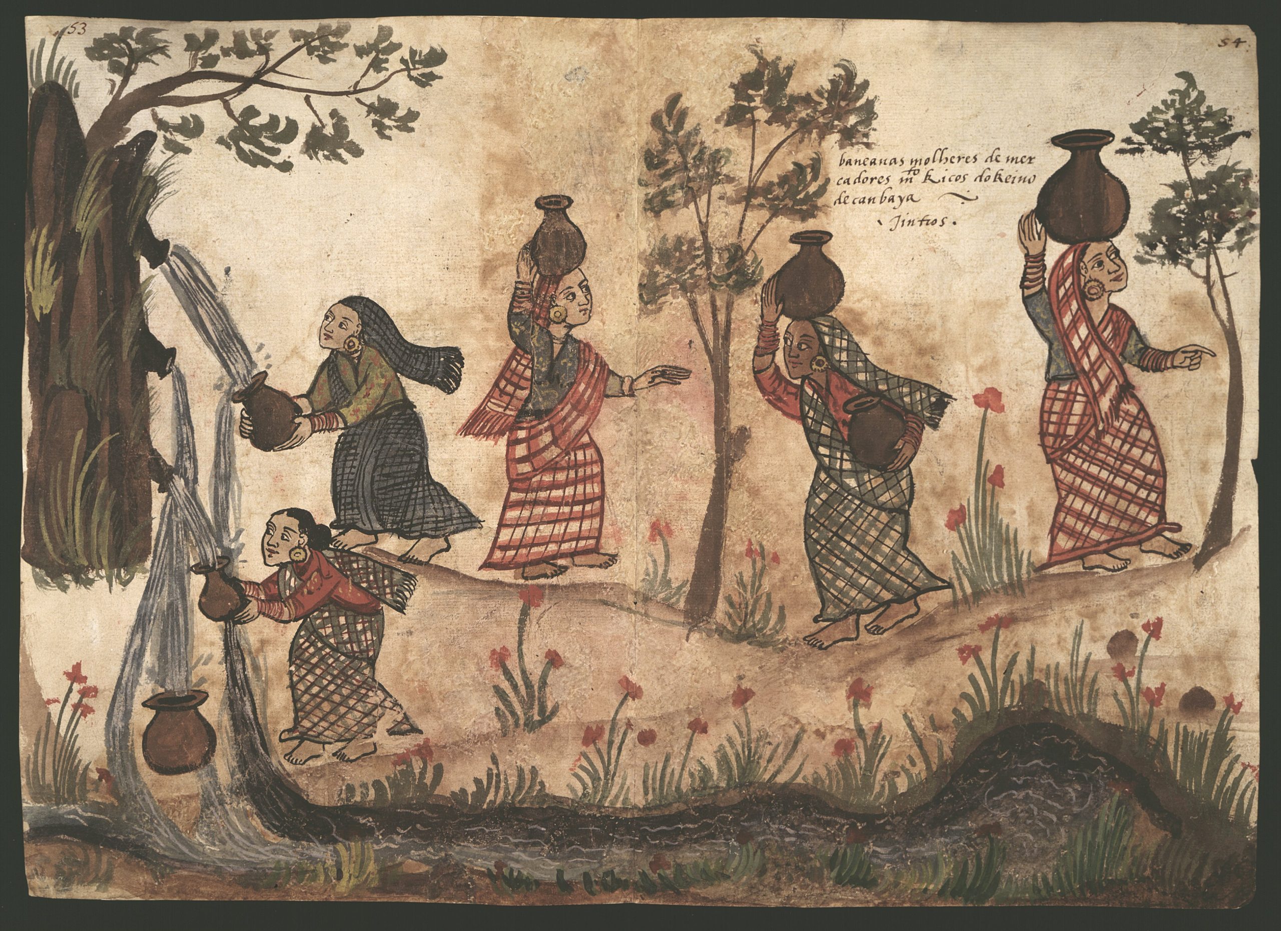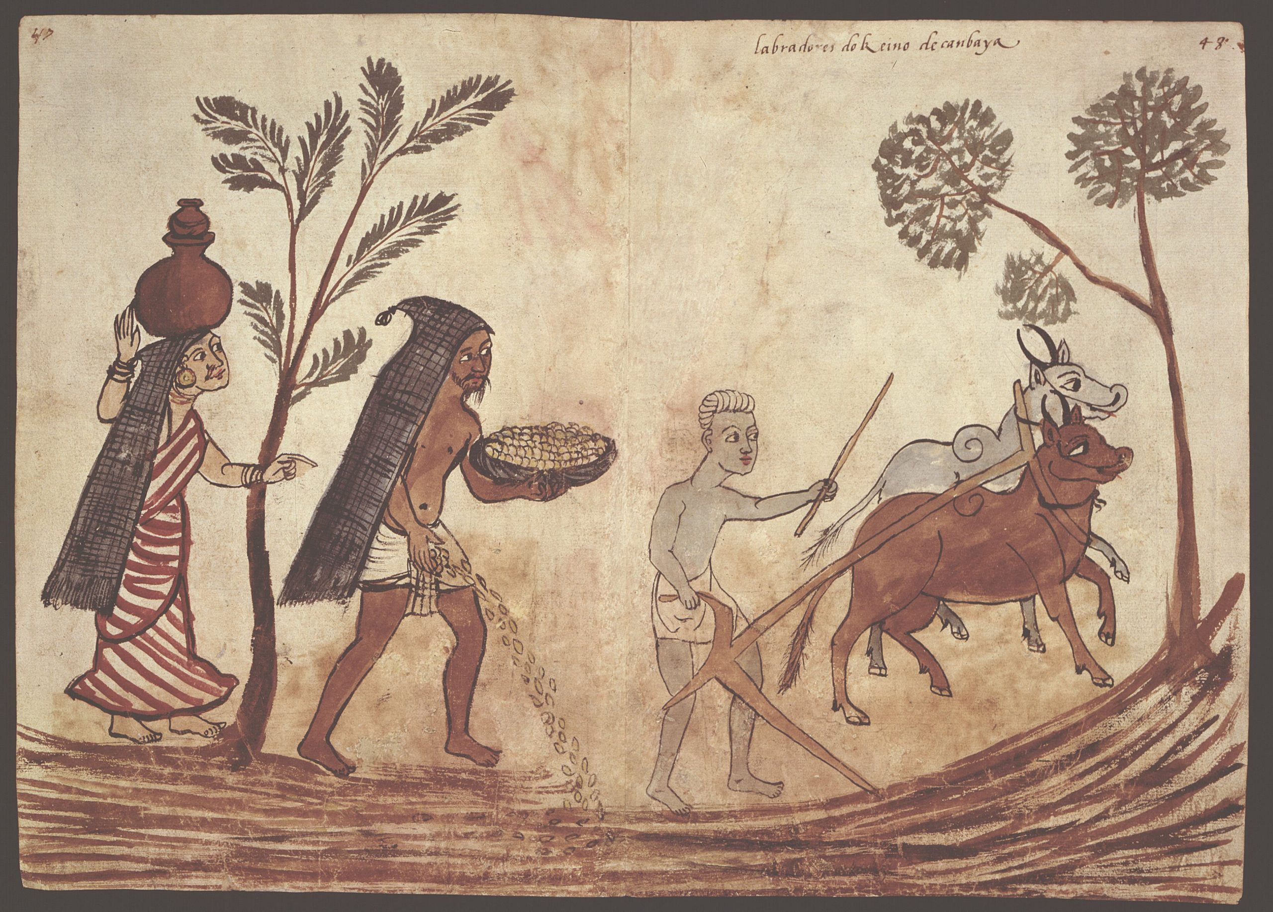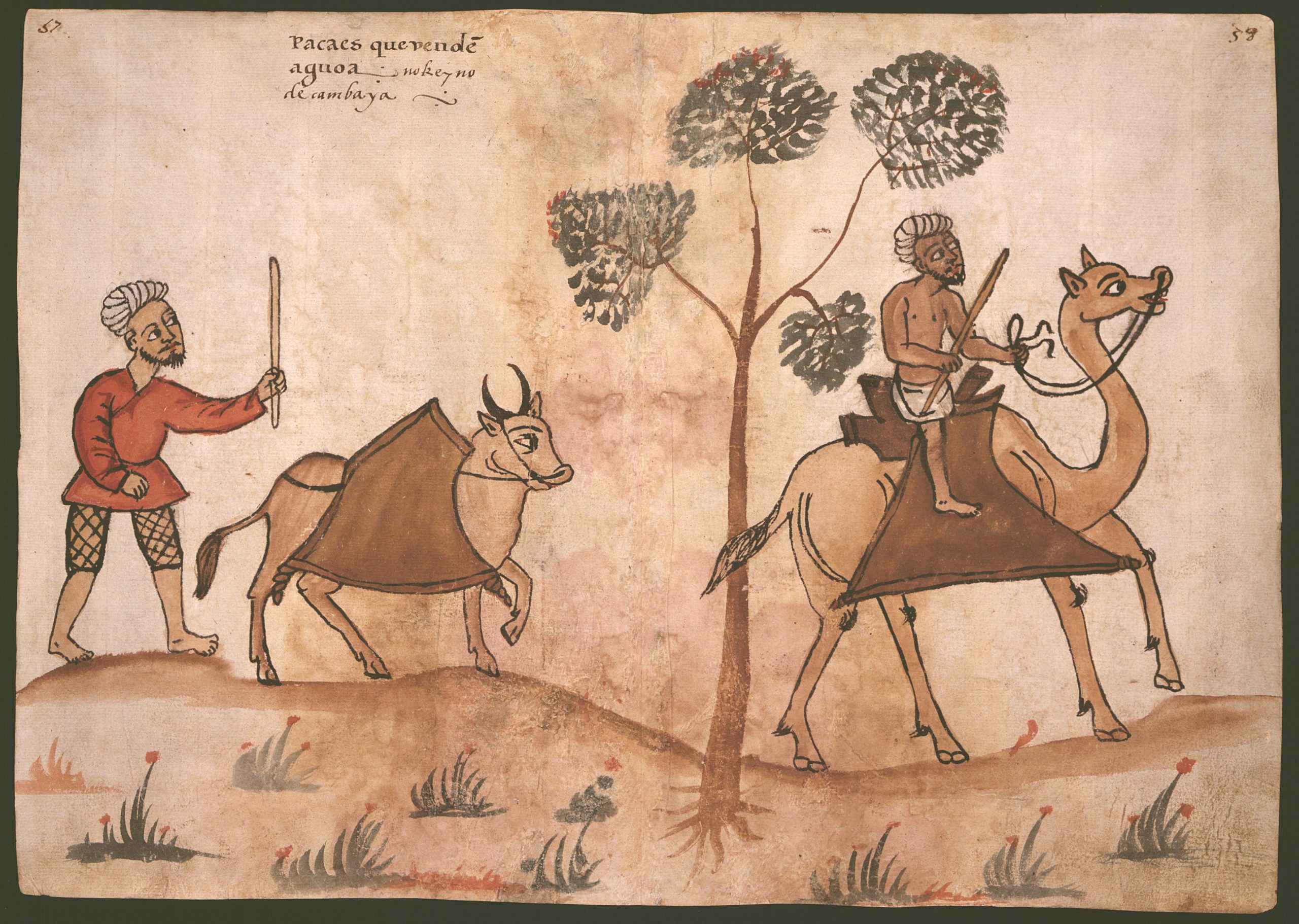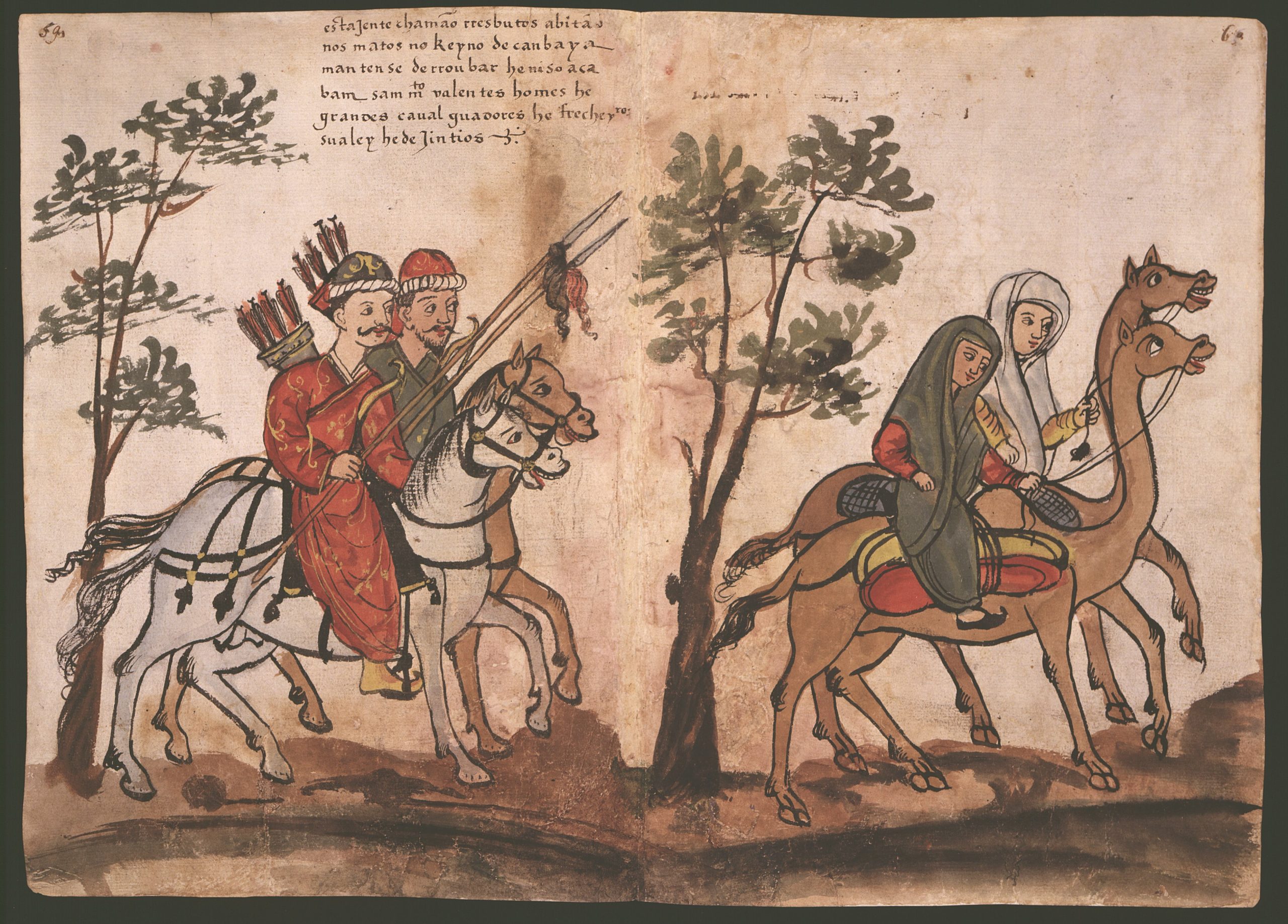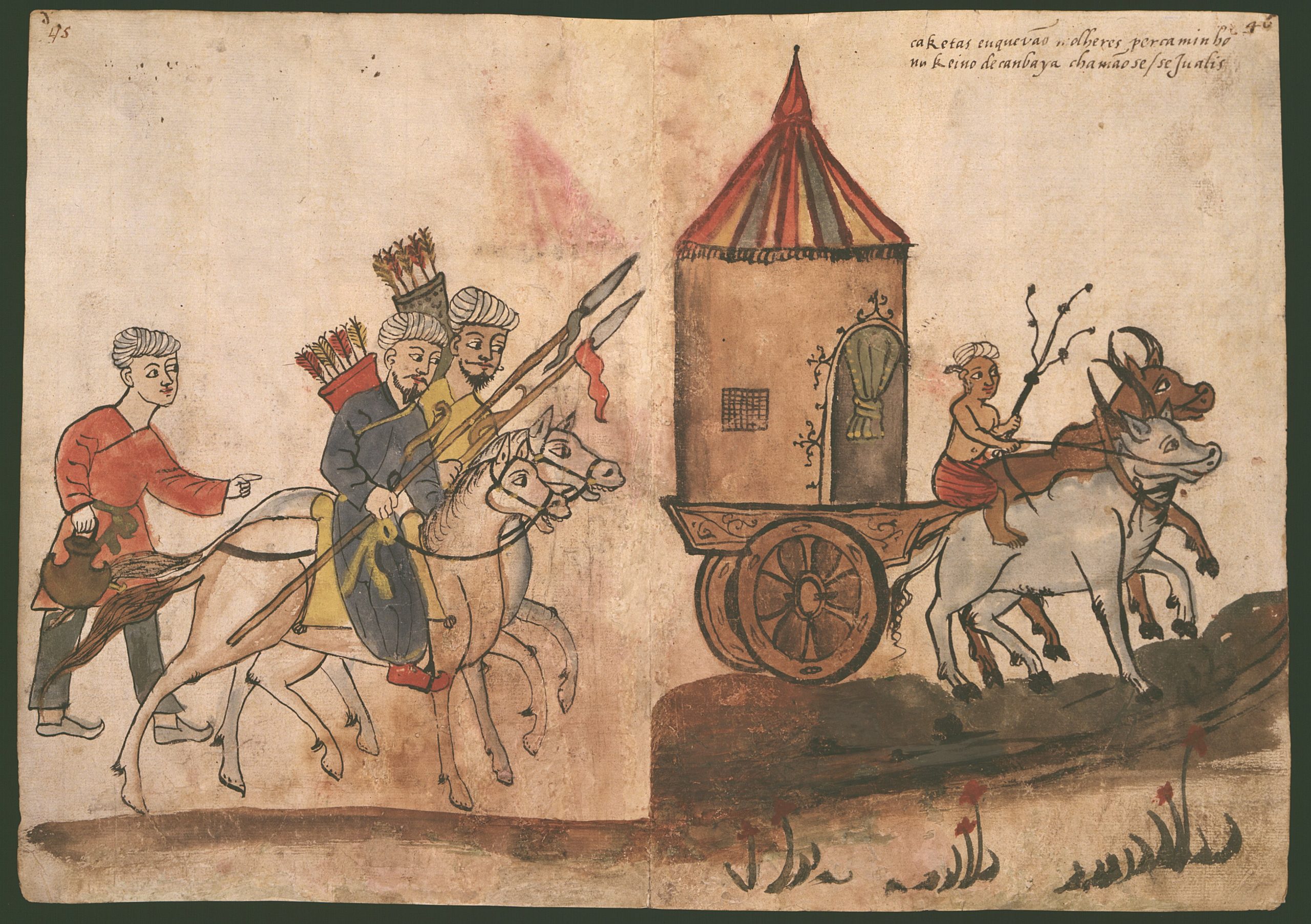 “Dipoi detto Nicolò se ne partí, e in capo di dieci giorni arrivò alla città di Cambaia, posta fra terra verso tramontana, ed è di circuito 12 miglia. Quivi nasce spico nardo, lacca, mirabolani, endego, e seta in grande abbondanza. Evvi una sorte di sacerdoti chiamati Bancani (…). Questi sacerdoti non mangiano cosa che abbia vita, ma solamente frutti, risi, latte, legumi. Sonvi molti buoi selvatichi, che hanno i crini di cavalle, ma piú lunghi, e hanno le corna sí lunghe che, piegando un poco la testa adietro, toccano con esse la coda: e per la lor grandezza usano gli abitanti queste corna in luogo di vasi per portar acqua, overo altre cose da bere per cammino.”