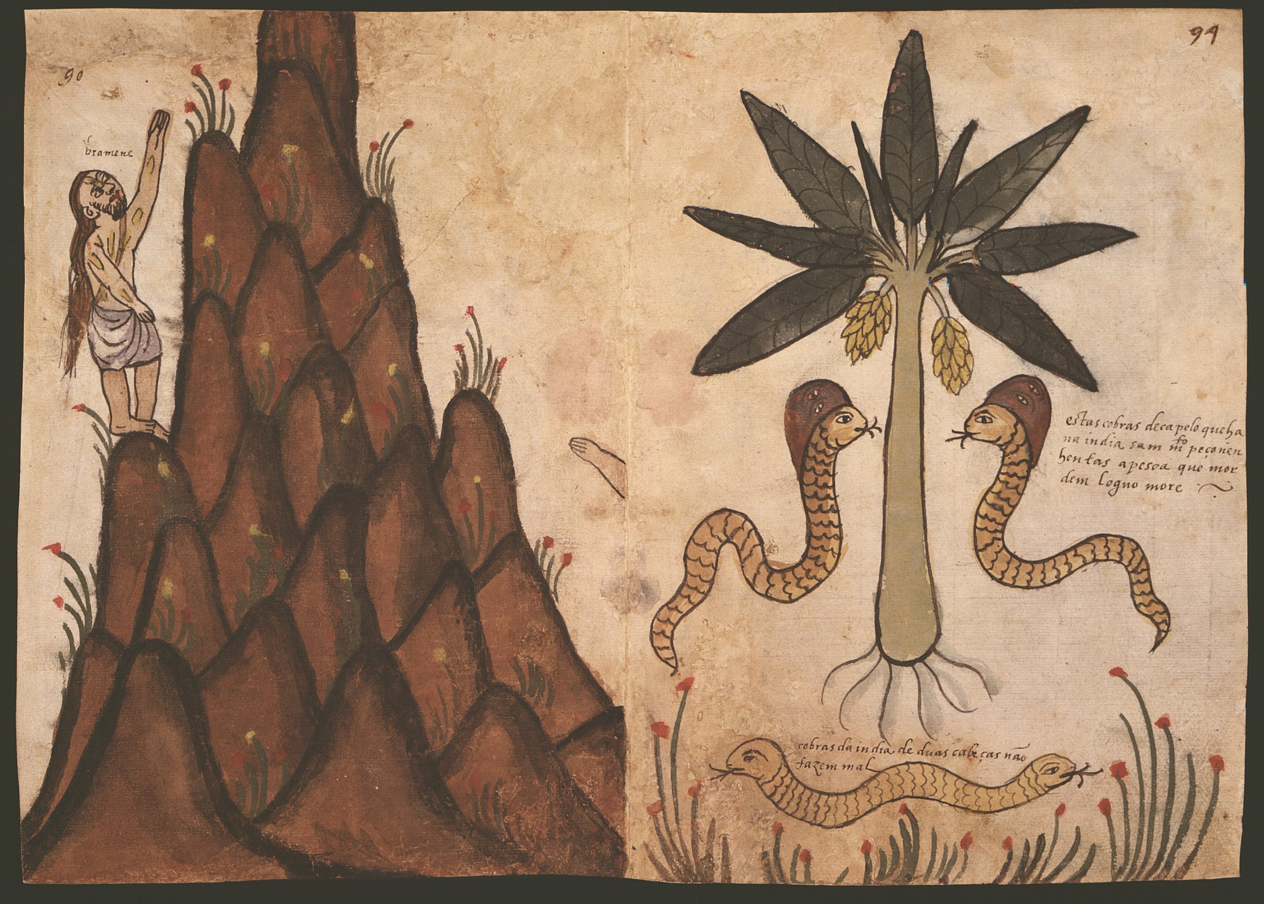 Scena con un bramino che sale su una roccia e tre immagini simboliche di cobra, di cui uno a due teste. Nella scena dei serpenti: due serpenti a sonagli incappucciati ai lati di una pianta o di un albero. Al di sotto, tra l'albero e una vegetazione con fiori rossi che ricorre frequentemente negli altri fogli, un serpente a due teste.